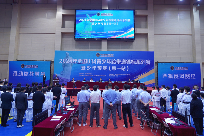 本网讯 4月25日上午,2024年全国U14青少年跆拳道锦标系列赛暨少年赛预赛(第一站)在我校体育运动中心举行。中国跆拳道协会竞赛部部长陈亮,湖北省跆拳道协会会长马剑平,湖北省体育局重竞技运动管理中心副主任张琼雯,黄冈市体育事业发展中心主任余觅,我校党委常委、副校长夏庆利参加开幕式。