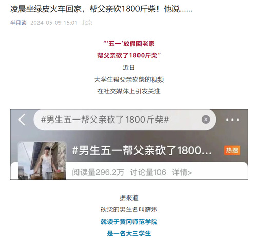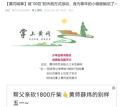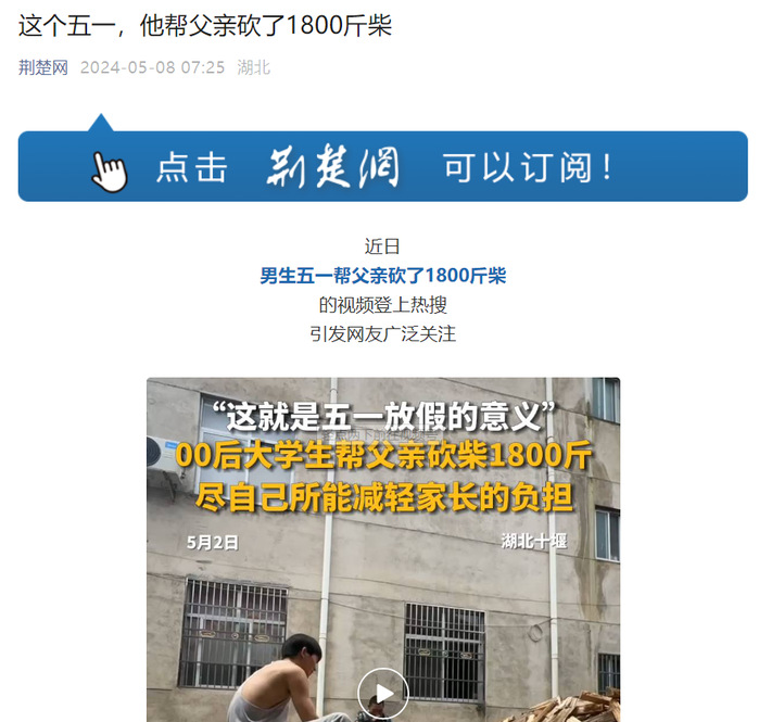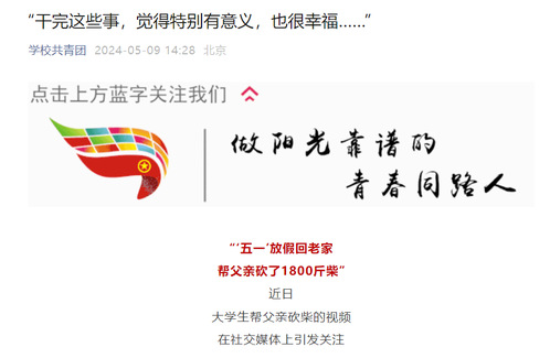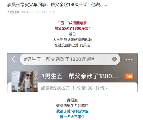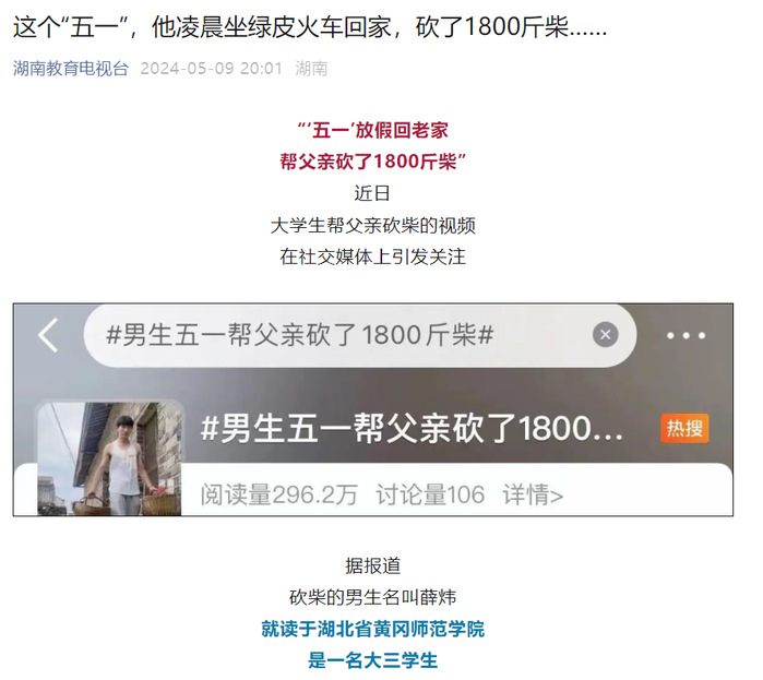 近日,我校体育学院大三学生薛炜五一回老家帮父亲砍了1800斤柴的故事在社交媒体上受到热烈关注和讨论,人民日报、半月谈、中国青年报、腾讯新闻、极目新闻、湖南教育电视台、荆楚网等多家主流媒体纷纷进行了报道,共青团中央学校部、湖北省教育厅、江西共青团、广州政法等多家单位在官方平台予以推介。