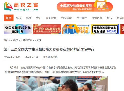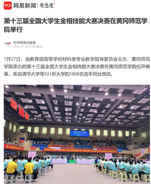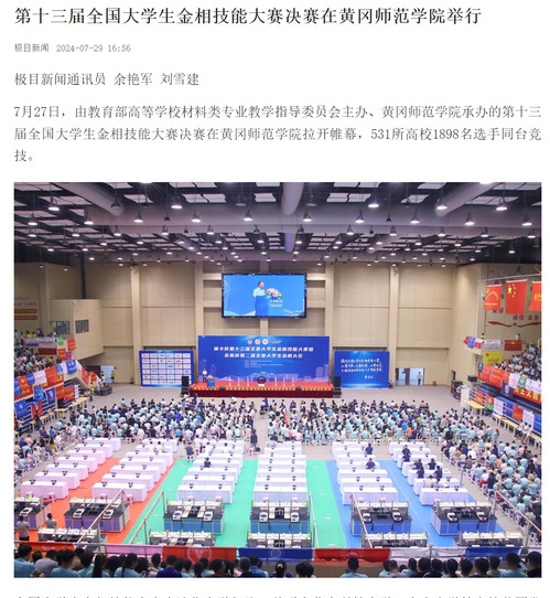 7月25日至30日,第十三届全国大学生金相技能大赛决赛在我校举行,来自清华大学等531所大学的1898名选手同台竞技。该大赛是材料类专业规格最高、制度最健全、规模最大、影响最广泛的全国性大学生学科赛事,受到媒体广泛关注,新华社、光明日报、中央广电总台国际在线、中国教育报、中国青年报、中新网、中华网、高校之窗、中国教育在线、新浪新闻、网易新闻、湖北日报、极目新闻、长江云、荆楚网、黄冈日报等众多主流媒体对大赛盛况进行了专门报道。